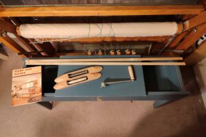 Comes with a 10-dent reed, a warping board, a weaving bench, a few shuttles, bobbins reed hook and some other small items.
